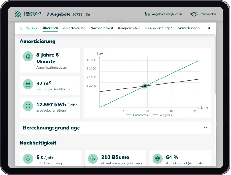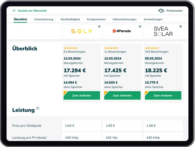 Sie erhalten zudem eine Einschätzung der zu erwartenden Stromerzeugung in kWh, was Ihnen hilft, die Wirtschaftlichkeit der verschiedenen Angebote zu bewerten.
